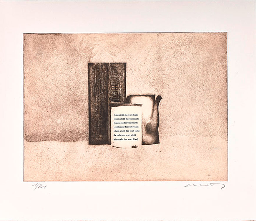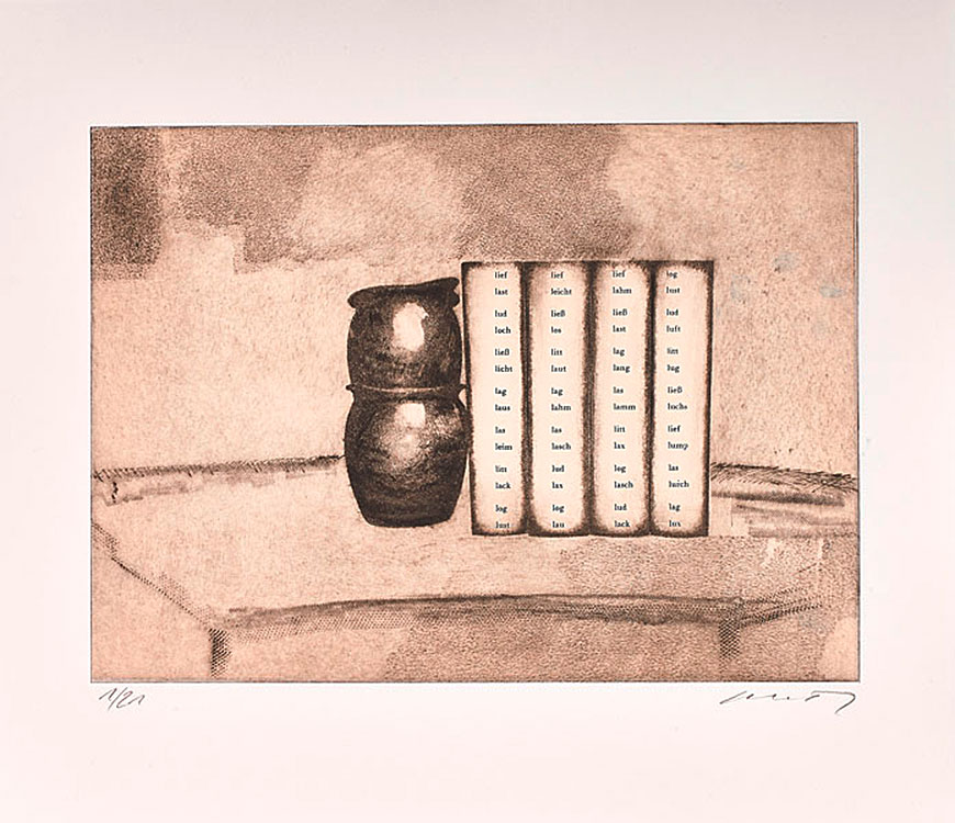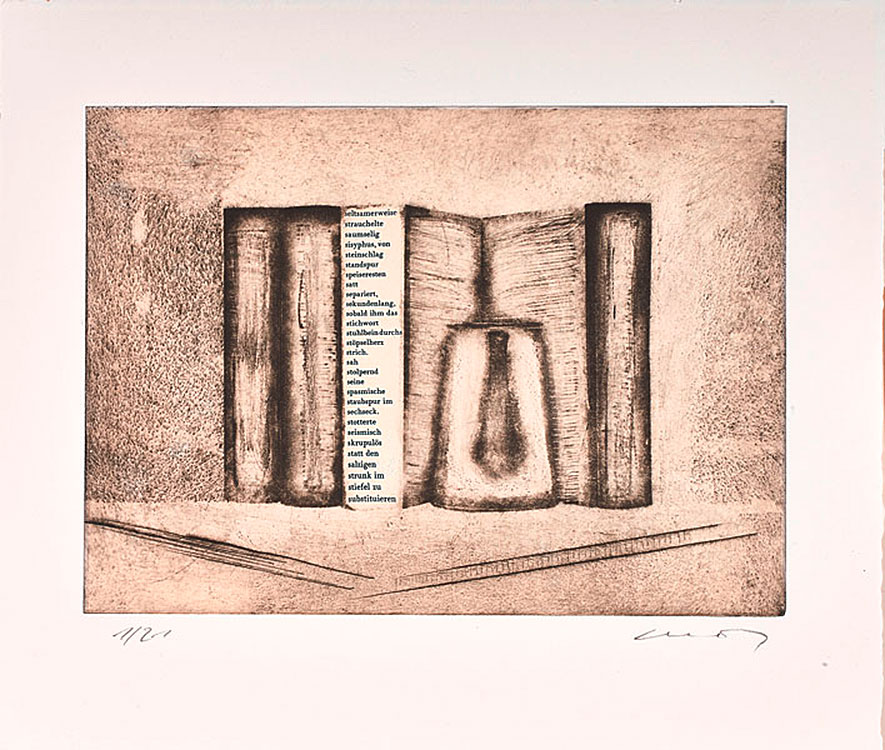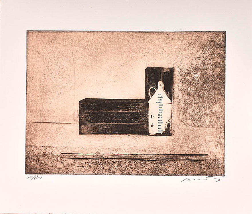 Modo Morandi: a portfolio of seven etchings by Dietmar Pfister and seven poems by Franz Mon, senior master of Concrete poetry, combining literature and art through the alliance of both artists.